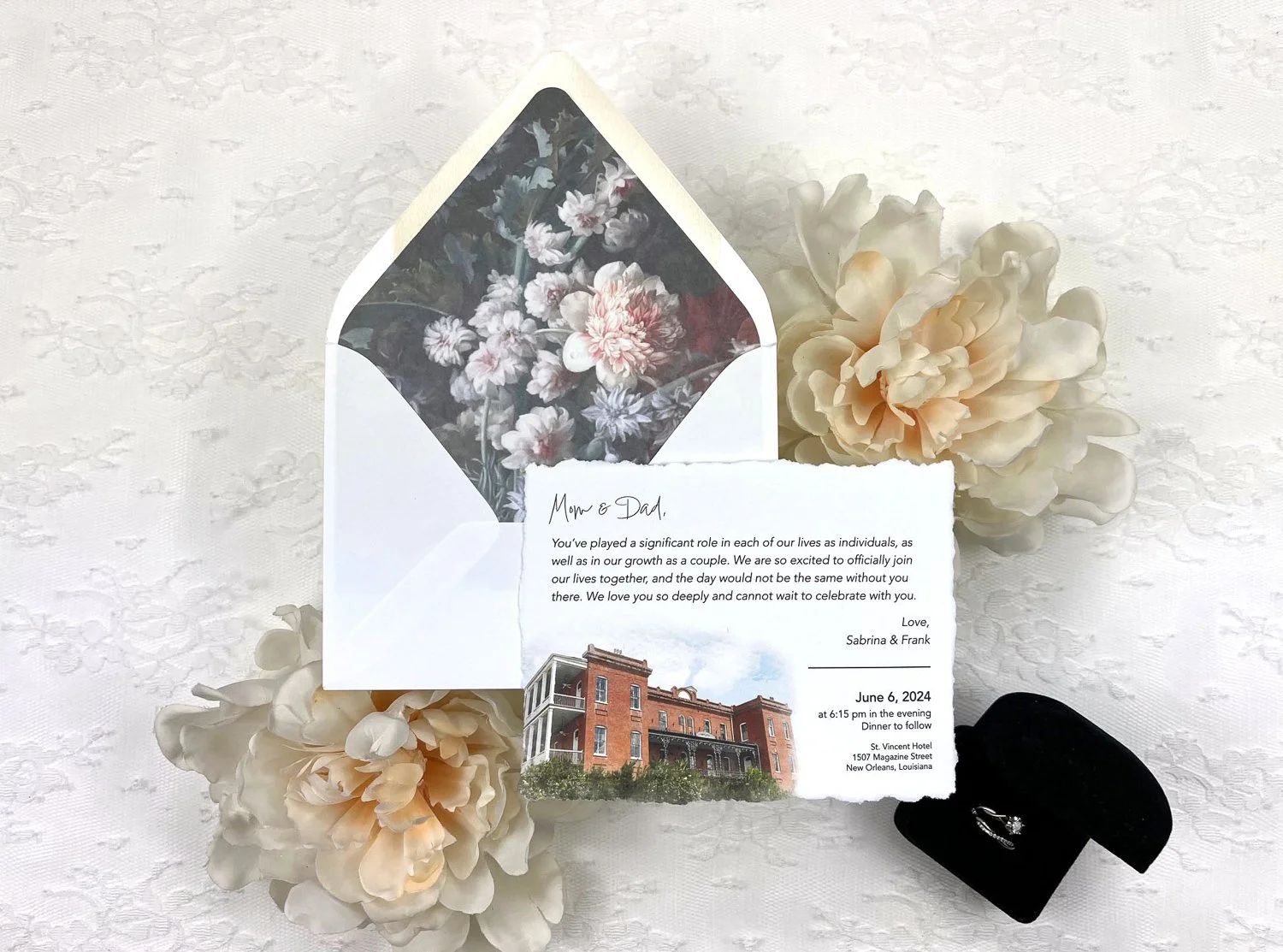 Hannah and Corey did exactly that when creating their custom wedding stationery. They were married at Il Mercato, one of the most popular venues in New Orleans. Il Mercato boasts historic Spanish architecture, but despite its age, it feels clean and modern with plenty of opportunities for “wow” moments.